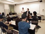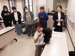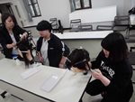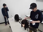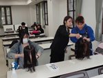 | 学校法人兵庫県整容学園姫路理容美容専門学校から後藤恵子教頭先生、菊谷修平先生に講師として来ていただき、「職人に学ぶ 理美容体験会」を実施しました。理容・美容業に関する説明のあと、はさみ、くし、髪どめなど、道具の名前や使い方を教えていただき、くしを持ったままのはさみの使い方などを実演していただきました。普段、カットしていただいている時には気づいていませんでしたが、それらはとても難しい動きでした。その後、ウイッグ(カット練習用の首から上の人形)を使った体験実習にうつりました。学園生は講師の先生のアドバイスを受けながら、時間いっぱい、時間になってもはさみを手からはなしませんでした。普段はできない貴重な体験をさせていただきました。ありがとうございました。 | |